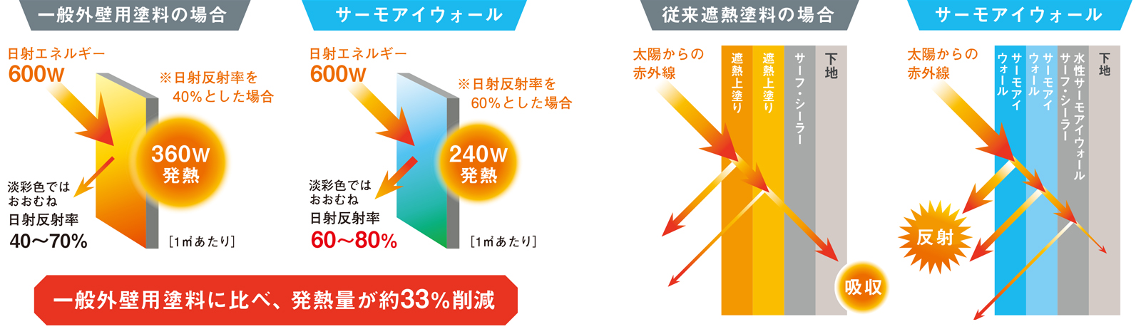 外壁用の遮熱塗料サーモアイウォール。上塗り、下塗りダブル反射による塗膜トータルで高い遮熱性能を実現。日本ペイントのハイスペックな塗料です。日差しを跳ね返して建物の基材(外壁や屋根材)を過度の熱から守ってくれる。そんな特徴をもった塗料で、ジェニュインが行う塗装の8割以上がこの遮熱塗料による施工です。