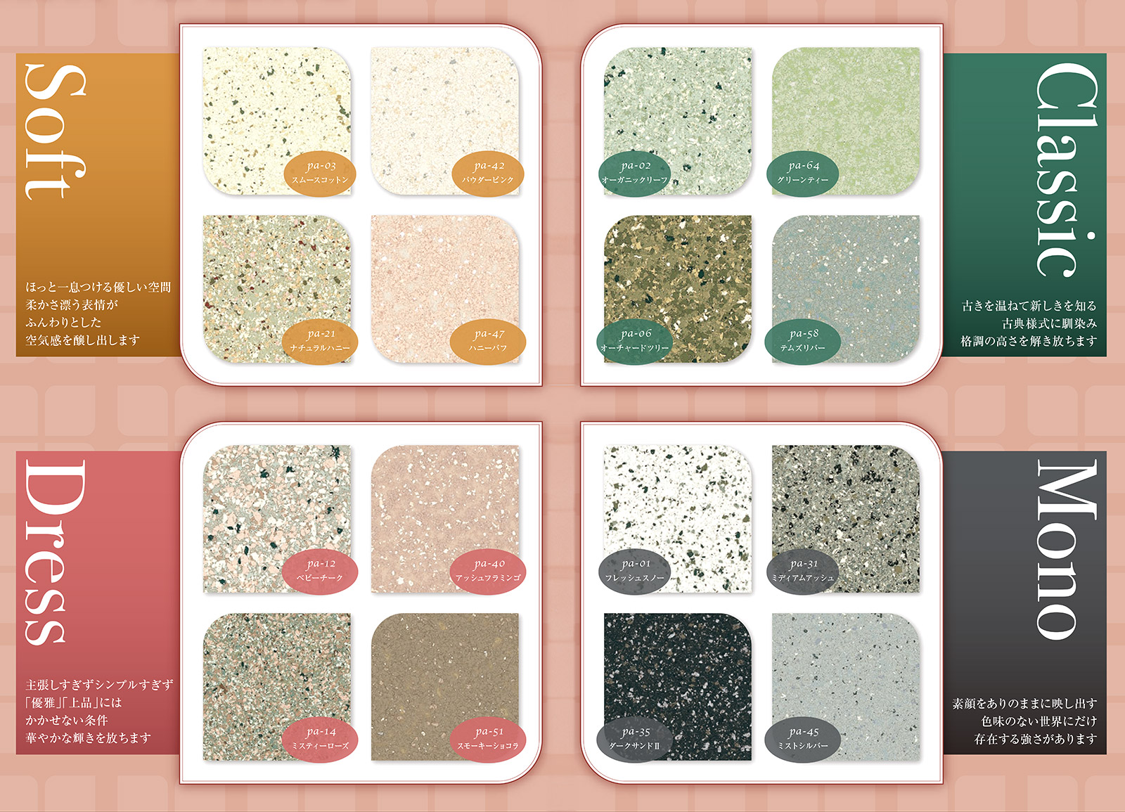 積水ハウスのフレアトーン同様に、積水ハウスの格調高い佇まいに似合う日本ペイントの「多彩模様塗料」ペリアートUV が人気です。単一色ではなく、様々な複合色が創り出す自然本来の優しい彩りが、積水ハウスの外壁に深い味わいをかもし出します。表層のシリコン系クリヤーにより、美しい意匠を長く持続させることが出来ます。